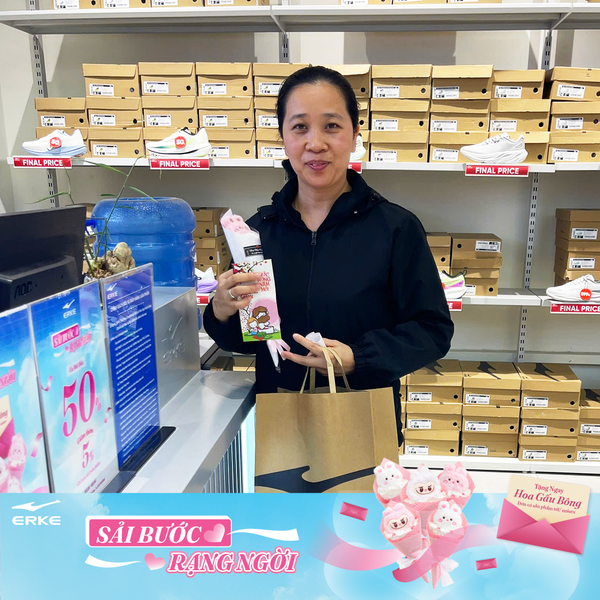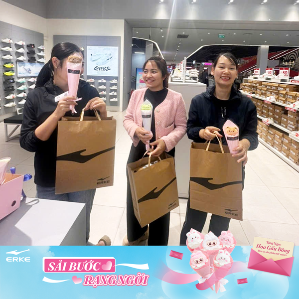 Từ ngày 6/3 đến 8/3, không khí tại hệ thống cửa hàng ERKE SPORTS trở nên rộn ràng hơn bao giờ hết. Hàng trăm khách hàng nữ đã vô cùng bất ngờ và thích thú khi nhận được bó hoa gấu bông xinh xắn ngay tại quầy thanh toán.