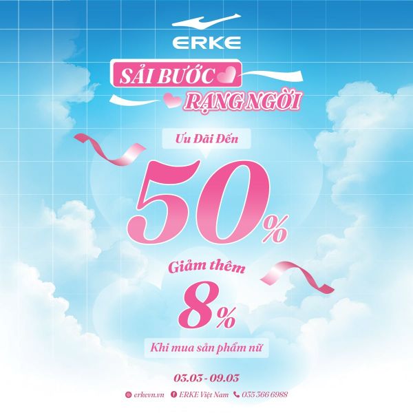 Tháng Ba gõ cửa cũng là lúc phái đẹp tỏa sáng rạng ngời. Nhân dịp Ngày Quốc tế Phụ nữ 8/3, ERKE chính thức triển khai chương trình khuyến mãi đặc biệt trên toàn hệ thống ERKE SPORTS, mang đến cơ hội mua sắm siêu hấp dẫn cùng hàng trăm phần quà dễ thương dành tặng khách hàng nữ.